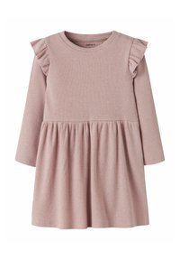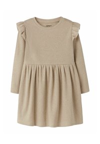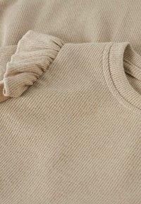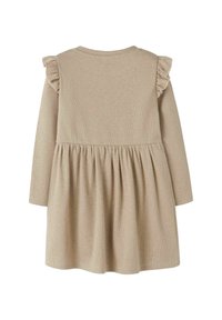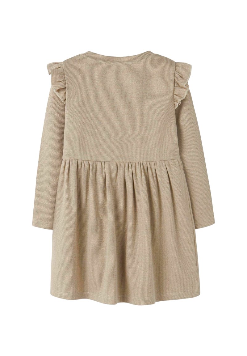 Långärmad klänning i beige ribbat tyg, med rynkade axeldetaljer och en utsvängd kjol med samlade detaljer.